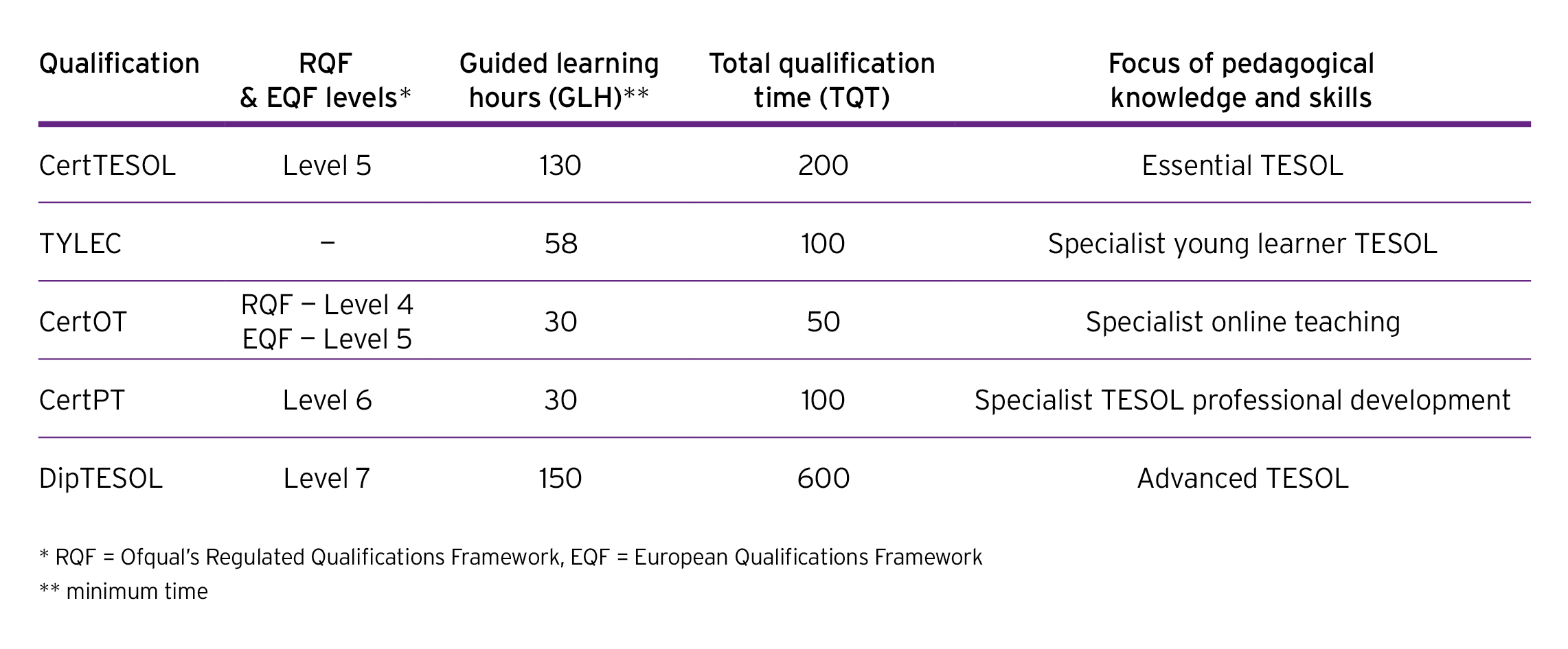 Course participants develop their ability to evaluate, adapt, create and reflect on the use of context-specific teaching resources. Teaching contexts include, for example, teaching young learners, teaching English for specific or academic purposes, or teaching within CLIL (content and language integrated learning) settings. The Trinity CertPT is a Level 6 qualification, which is between an initial Level 5 teacher education certificate and an advanced Level 7 diploma qualification.