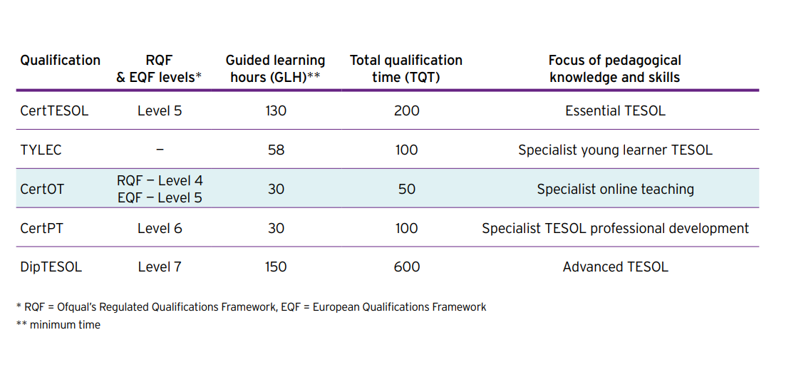 Assessment for the CertOT qualification focuses on the knowledge and skills necessary for online teaching in general, which means it’s suitable for English language teachers from a variety of different contexts and settings. The table below illustrates how the CertOT can be used to supplement an initial or advanced teaching qualification for the purposes of continuing professional development in TESOL.